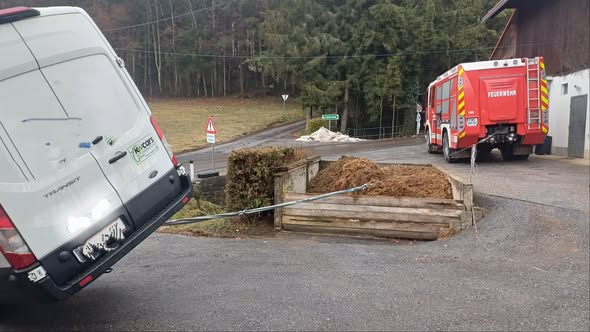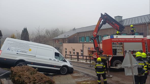 Tätigkeiten am Einsatzort: Ein Kleinbus konnte bei einem Wendemanöver nicht mehr rechtzeitig bremsen, rutschte daraufhin in die Lieboch und drohte umzukippen. Nachdem das Fahrzeug gesichert wurde, konnten die Kameraden den unverletzten Fahrer über die Beifahrertür in Sicherheit bringen.